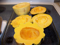 3:24 Acorn, half a spaghetti and a sweet dumpling are in the oven. Will also be cutting up and roasting half an ambercup. A couple of the squash were VERY hard so were difficult to cut in half so I need a rest. Oh, and the squash in the oven were cut in half, scooped out, dotted with butter and placed in 13x9 pan with 1/4" water, covered, and will cook for 30-40 minutes at 400.